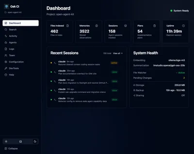 That’s it! OAK is now running. The dashboard is your primary interface — use it to configure settings, explore agent activity, search code, and manage project memory. The CLI is only needed for setup and maintenance tasks.
